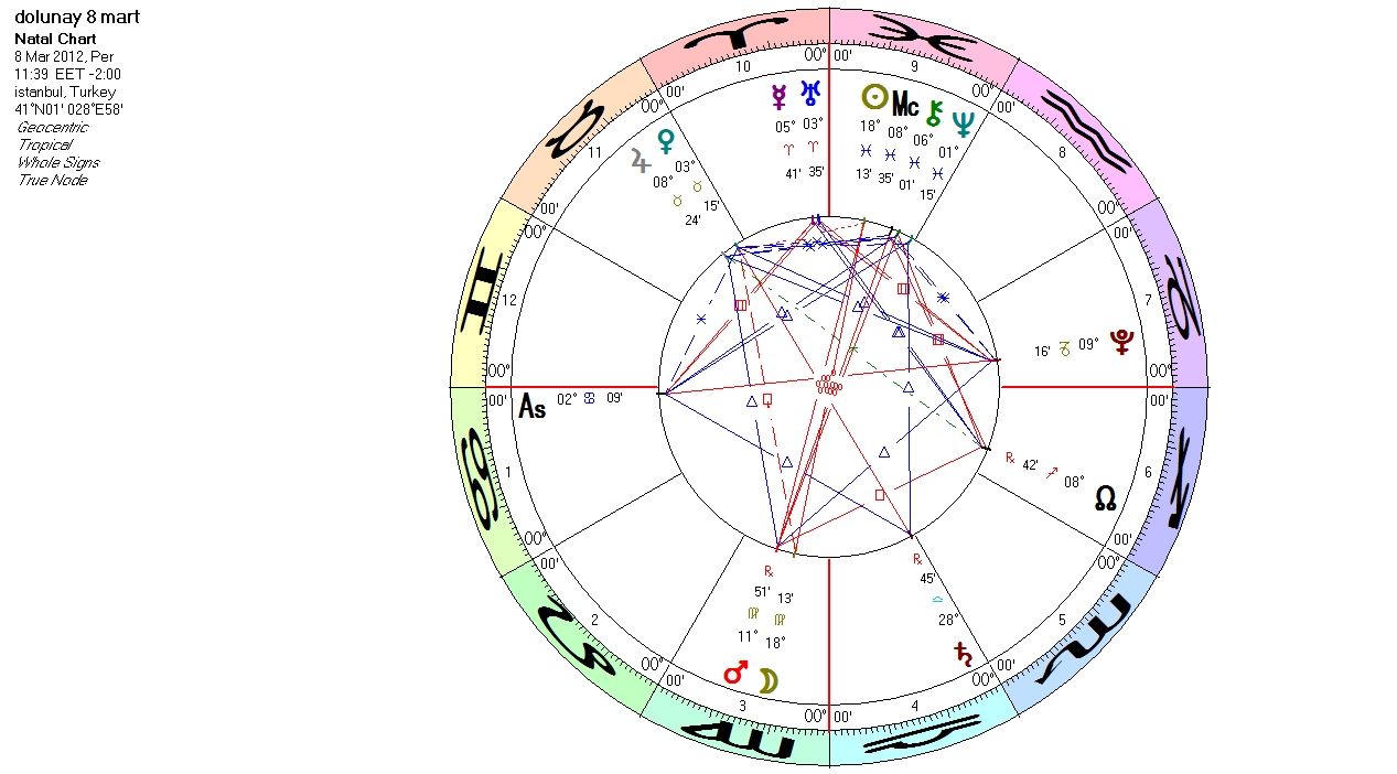 08 Mart 2012 saat 11:39’da gerçekleşecek olan Başak burcundaki Dolunay’ı incelemeye aldığımızda, Dolunay saati Ay’ın yönettiği burç olan Yengeç’in ufuktan yükseldiğini (Dolunay anı yükseleni) görüyoruz. Başak burcunda duygular değil de günlük, gündelik işlerin ön planda olduğunu düşünürsek, bir süreliğine en hassas su gruplarının bile duygusallığı kenara bırakıp, işlerini yoluna sokmak için çalışmaları gereken bir sürecin devrede olduğunu söyleyebiliriz.